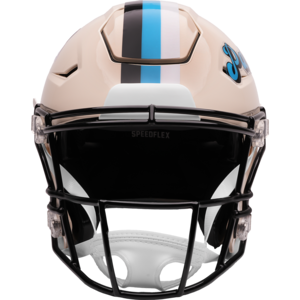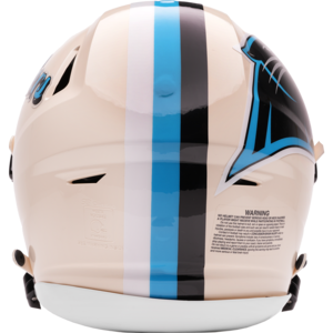 Based on one of the most popular on-field designs, this SpeedFlex Authentic football helmet is made specifically for fans of the Carolina Panthers and blends modern performance with classic style. Part of the Retro Collection, it draws inspiration from the 70s and 80s, honoring the team’s historic past with a cream gloss shell finish, team-colored face mask, and a three-color top stripe in team colors. The team logo appears on the right side of the helmet, while the team name is displayed on the left in a retro-inspired font. At approximately 11 inches tall, this authentic-size display helmet is perfect for football fans and ideal for autographs. It features a large SpeedFlex shell, S2BD-SW-SP face mask, 4-point chinstrap, and official paint and decals, making it a standout piece for collectors and fans who appreciate a touch of nostalgia in their game-day style. The perfect collectible or gift! SKU: 8060267
