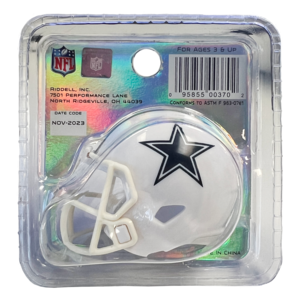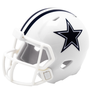 The Dallas Cowboys Limited Edition On-Field Alternate Pocket Size Helmet features a white shell, white facemask and the standard Cowboys side decoration and center stripe. This helmet was first worn by the Cowboys on-field in 2022 and has been worn by the team on rare occasions since then. This helmet is available exclusively on Riddell.com. Features:
