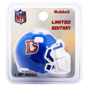 The Denver Broncos Limited Edition Throwback Pocket Size Helmet features a royal blue shell, white facemask, throwback Broncos logos and a center stripe. The helmet was first worn from 1975-1996 and the team announced this summer that they will be wearing the helmet again on-field this season. This helmet is available exclusively on Riddell.com. Features: