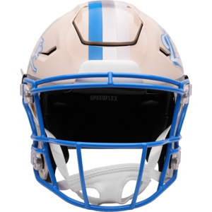 Based on one of the most popular on-field designs, this SpeedFlex Authentic football helmet is made specifically for fans of the Detroit Lions and blends modern performance with classic style. Part of the Retro Collection, it draws inspiration from the 70s and 80s, honoring the team’s historic past with a cream gloss shell finish, team-colored face mask, and a three-color top stripe in team colors. The team logo appears on the right side of the helmet, while the team name is displayed on the left in a retro-inspired font. At approximately 11 inches tall, this authentic-size display helmet is perfect for football fans and ideal for autographs. It features a large SpeedFlex shell, S2BD-SW-SP face mask, 4-point chinstrap, and official paint and decals, making it a standout piece for collectors and fans who appreciate a touch of nostalgia in their game-day style. The perfect collectible or gift! SKU: 8060265