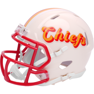 Based on one of the most popular on-field designs, this Speed Mini football helmet is made specifically for fans of the Kansas City Chiefs and blends modern performance with classic style. Part of the Retro Collection, it draws inspiration from the 70s and 80s, honoring the team’s historic past with a cream gloss shell finish, team-colored face mask, and a three-color top stripe in team colors. The team logo appears on the right side of the helmet, while the team name is displayed on the left in a retro-inspired font. At approximately 5.5 inches tall, this authentic-size display helmet is perfect for football fans and ideal for autographs. It features a mini Speed shell, S2BD-SW-SP face mask, 4-point chinstrap, and official paint and decals, making it a standout piece for collectors and fans who appreciate a touch of nostalgia in their game-day style. The perfect collectible or gift! SKU: 8060358