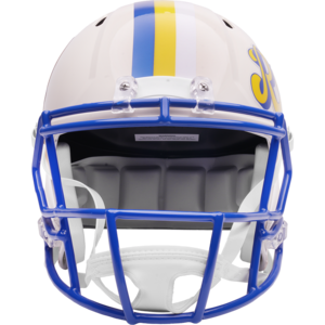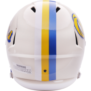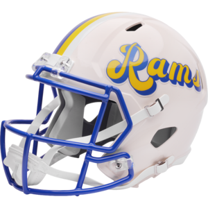 Based on one of the most popular on-field designs, this Speed Replica football helmet is made specifically for fans of the Los Angeles Rams and blends modern performance with classic style. Part of the Retro Collection, it draws inspiration from the 70s and 80s, honoring the team’s historic past with a cream gloss shell finish, team-colored face mask, and a three-color top stripe in team colors. The team logo appears on the right side of the helmet, while the team name is displayed on the left in a retro-inspired font. At approximately 9.5 inches tall, this authentic-size display helmet is perfect for football fans and ideal for autographs. It features a medium Speed shell, S2BD-SW-SP face mask, 4-point chinstrap, and official paint and decals, making it a standout piece for collectors and fans who appreciate a touch of nostalgia in their game-day style. The perfect collectible or gift! SKU: 8060336