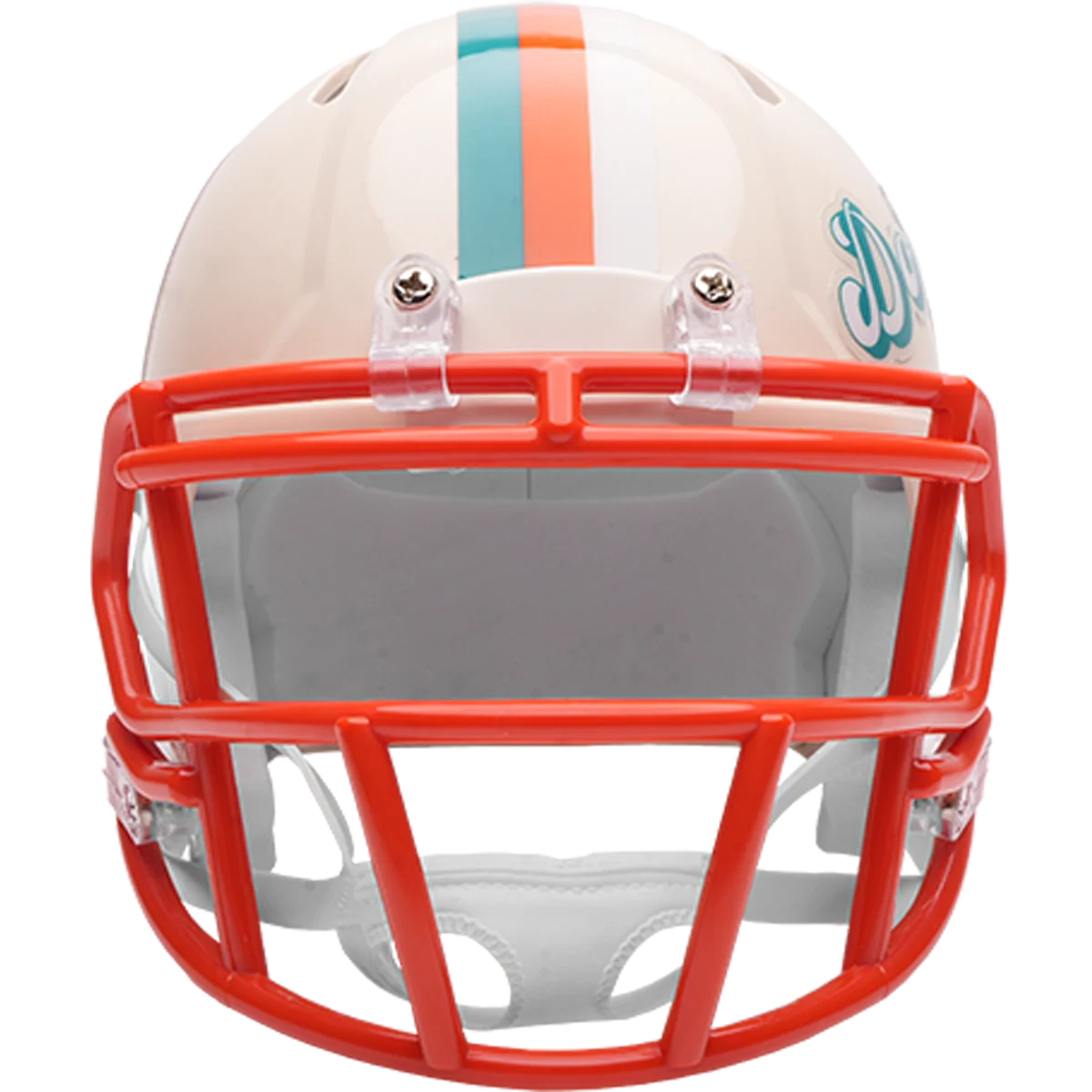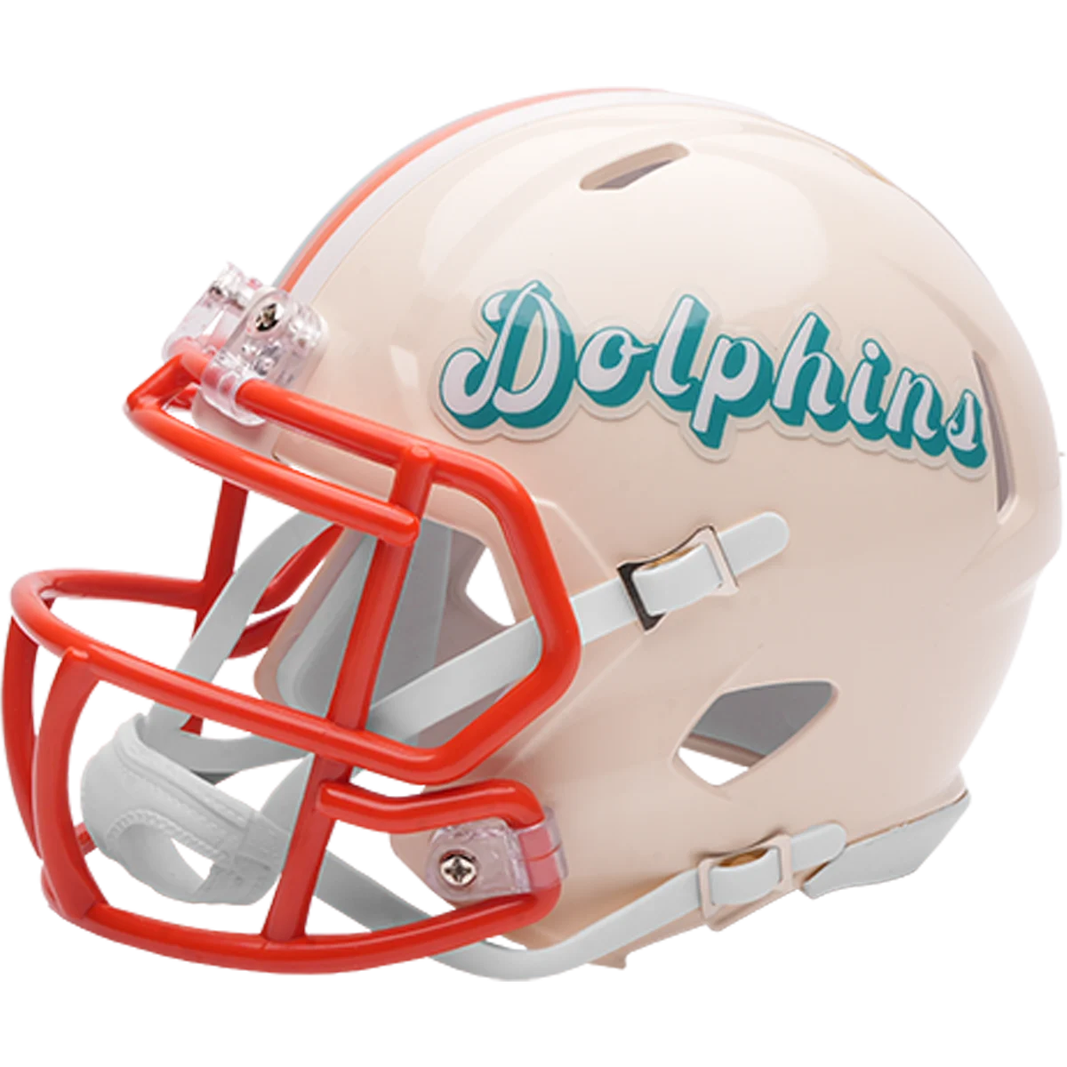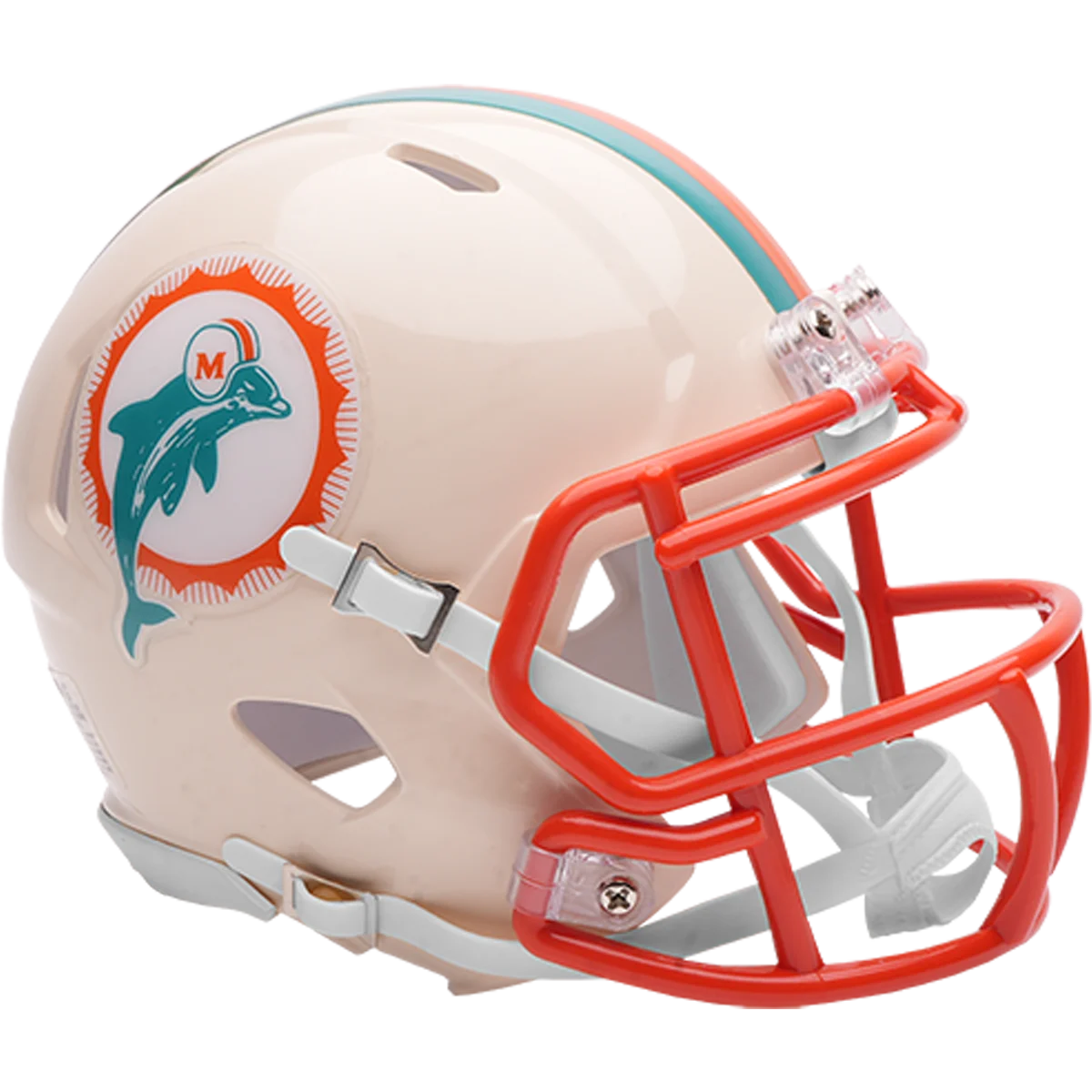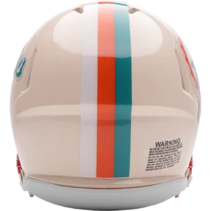 Based on one of the most popular on-field designs, this Speed Mini football helmet is made specifically for fans of the Miami Dolphins and blends modern performance with classic style. Part of the Retro Collection, it draws inspiration from the 70s and 80s, honoring the team’s historic past with a cream gloss shell finish, team-colored face mask, and a three-color top stripe in team colors. The team logo appears on the right side of the helmet, while the team name is displayed on the left in a retro-inspired font. At approximately 5.5 inches tall, this authentic-size display helmet is perfect for football fans and ideal for autographs. It features a mini Speed shell, S2BD-SW-SP face mask, 4-point chinstrap, and official paint and decals, making it a standout piece for collectors and fans who appreciate a touch of nostalgia in their game-day style. The perfect collectible or gift! SKU: 8060362