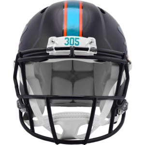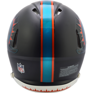 Based on one of the most popular on-field alternate designs, this collectible Speed Authentic football helmet is made specifically for fans of the Miami Dolphins. At approx. 11 in. tall, this authentic size display helmet is perfect for all football fans and great for autographs. The helmet features a large size Speed shell, the S2BD-SW-SP face mask, a 4-point chinstrap, and official paint and decals. The perfect collectible or gift! SKU: 8059968
