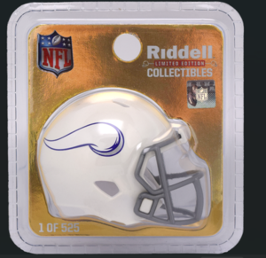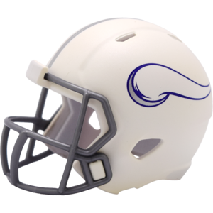 The Minnesota Vikings Limited Edition White On-Field Alternate Pocket Size Helmet features a white shell, silver facemask, silver center stripe and Viking horn logos. This helmet, which is part of the Winter Warrior alternate uniform, was worn on-field this season for the first time ever. This helmet is available exclusively on Riddell.com. Features: