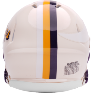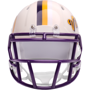 Based on one of the most popular on-field designs, this Speed Mini football helmet is made specifically for fans of the Minnesota Vikings and blends modern performance with classic style. Part of the Retro Collection, it draws inspiration from the 70s and 80s, honoring the team’s historic past with a cream gloss shell finish, team-colored face mask, and a three-color top stripe in team colors. The team logo appears on the right side of the helmet, while the team name is displayed on the left in a retro-inspired font. At approximately 5.5 inches tall, this authentic-size display helmet is perfect for football fans and ideal for autographs. It features a mini Speed shell, S2BD-SW-SP face mask, 4-point chinstrap, and official paint and decals, making it a standout piece for collectors and fans who appreciate a touch of nostalgia in their game-day style. The perfect collectible or gift! SKU: 8060379