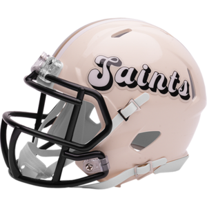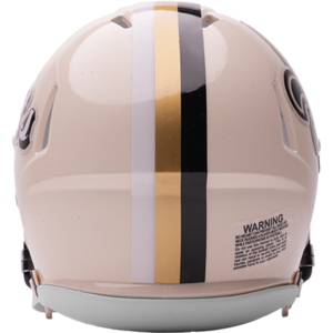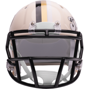 Based on one of the most popular on-field designs, this Speed Mini football helmet is made specifically for fans of the New Orleans Saints and blends modern performance with classic style. Part of the Retro Collection, it draws inspiration from the 70s and 80s, honoring the team’s historic past with a cream gloss shell finish, team-colored face mask, and a three-color top stripe in team colors. The team logo appears on the right side of the helmet, while the team name is displayed on the left in a retro-inspired font. At approximately 5.5 inches tall, this authentic-size display helmet is perfect for football fans and ideal for autographs. It features a mini Speed shell, S2BD-SW-SP face mask, 4-point chinstrap, and official paint and decals, making it a standout piece for collectors and fans who appreciate a touch of nostalgia in their game-day style. The perfect collectible or gift! SKU: 8060374