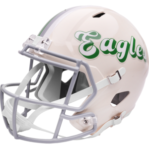 Based on one of the most popular on-field designs, this Speed Replica football helmet is made specifically for fans of the Philadelphia Eagles and blends modern performance with classic style. Part of the Retro Collection, it draws inspiration from the 70s and 80s, honoring the team’s historic past with a cream gloss shell finish, team-colored face mask, and a three-color top stripe in team colors. The team logo appears on the right side of the helmet, while the team name is displayed on the left in a retro-inspired font. At approximately 9.5 inches tall, this authentic-size display helmet is perfect for football fans and ideal for autographs. It features a medium Speed shell, S2BD-SW-SP face mask, 4-point chinstrap, and official paint and decals, making it a standout piece for collectors and fans who appreciate a touch of nostalgia in their game-day style. The perfect collectible or gift! SKU: 8060327