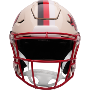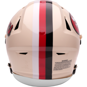 Based on one of the most popular on-field designs, this SpeedFlex Authentic football helmet is made specifically for fans of the San Francisco 49ers and blends modern performance with classic style. Part of the Retro Collection, it draws inspiration from the 70s and 80s, honoring the team’s historic past with a cream gloss shell finish, team-colored face mask, and a three-color top stripe in team colors. The team logo appears on the right side of the helmet, while the team name is displayed on the left in a retro-inspired font. At approximately 11 inches tall, this authentic-size display helmet is perfect for football fans and ideal for autographs. It features a large SpeedFlex shell, S2BD-SW-SP face mask, 4-point chinstrap, and official paint and decals, making it a standout piece for collectors and fans who appreciate a touch of nostalgia in their game-day style. The perfect collectible or gift! SKU: 8060246