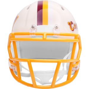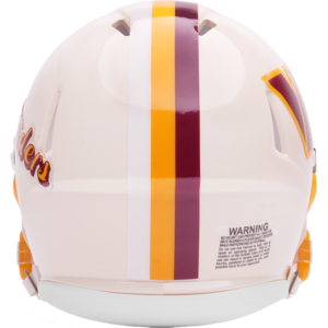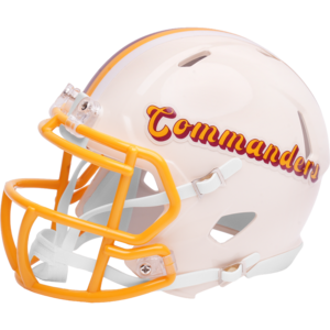 Based on one of the most popular on-field designs, this Speed Mini football helmet is made specifically for fans of the Washington Commanders and blends modern performance with classic style. Part of the Retro Collection, it draws inspiration from the 70s and 80s, honoring the team’s historic past with a cream gloss shell finish, team-colored face mask, and a three-color top stripe in team colors. The team logo appears on the right side of the helmet, while the team name is displayed on the left in a retro-inspired font. At approximately 5.5 inches tall, this authentic-size display helmet is perfect for football fans and ideal for autographs. It features a mini Speed shell, S2BD-SW-SP face mask, 4-point chinstrap, and official paint and decals, making it a standout piece for collectors and fans who appreciate a touch of nostalgia in their game-day style. The perfect collectible or gift! SKU: 8060360